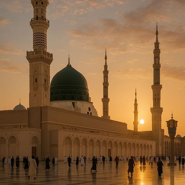 Dars après Fajr. Ziarat et balade autour du Haram. Dars “Correction de la Fatiha” après Dohr. Option : ascension d’Uhud avant Fajr, rappel et lever de soleil au sommet. Un souffle d’éternité.